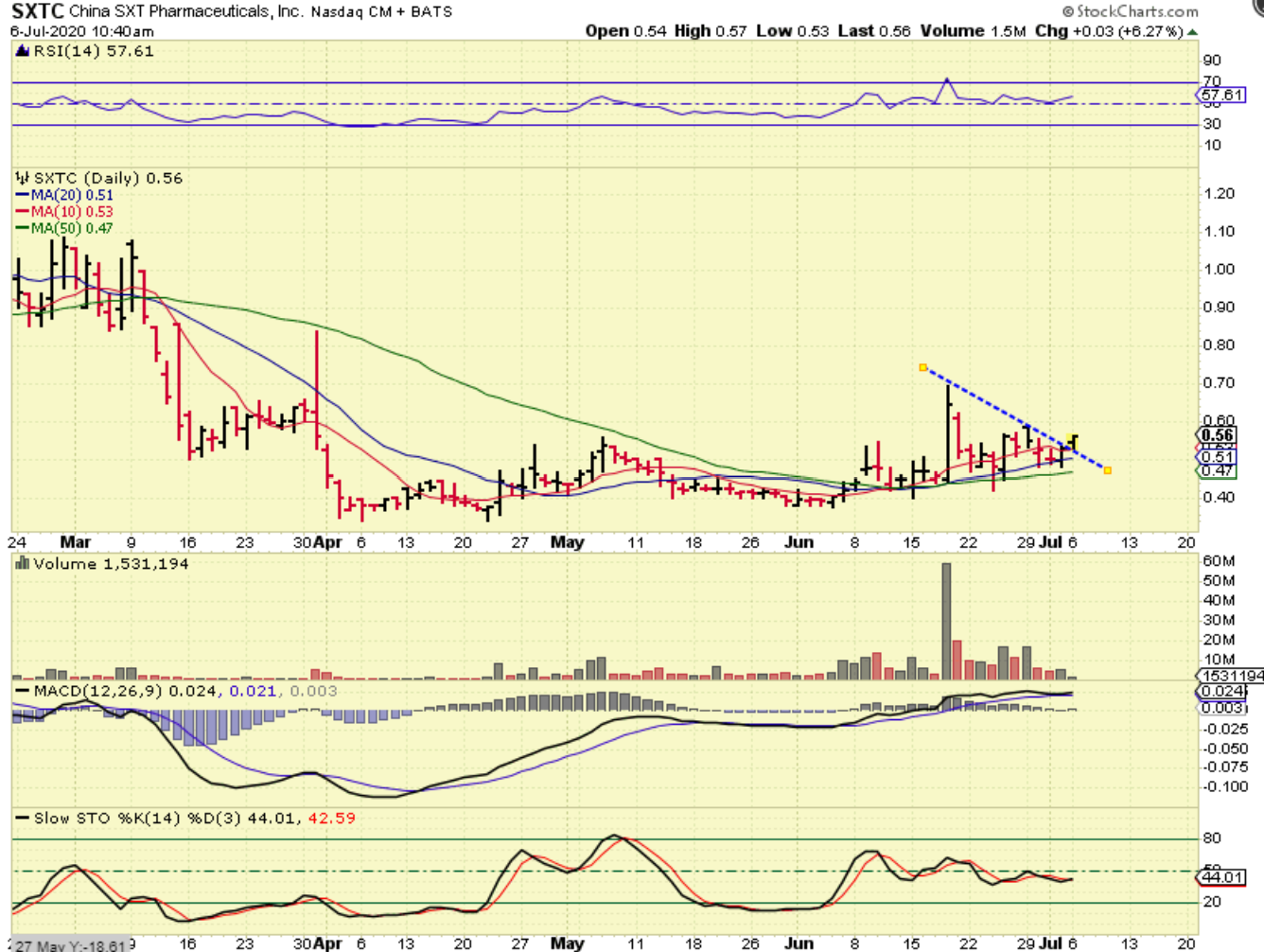 SXTC looked to be breaking out Monday, so I posted this in the first hr of trading. It closed a bit higher on 10 million, so this could find follow through & break out Tuesday too. For those that like to trade these, a break out can be bought with a stop under the 50sma (but if it chops, you may also be stuck in this base for a bit longer).