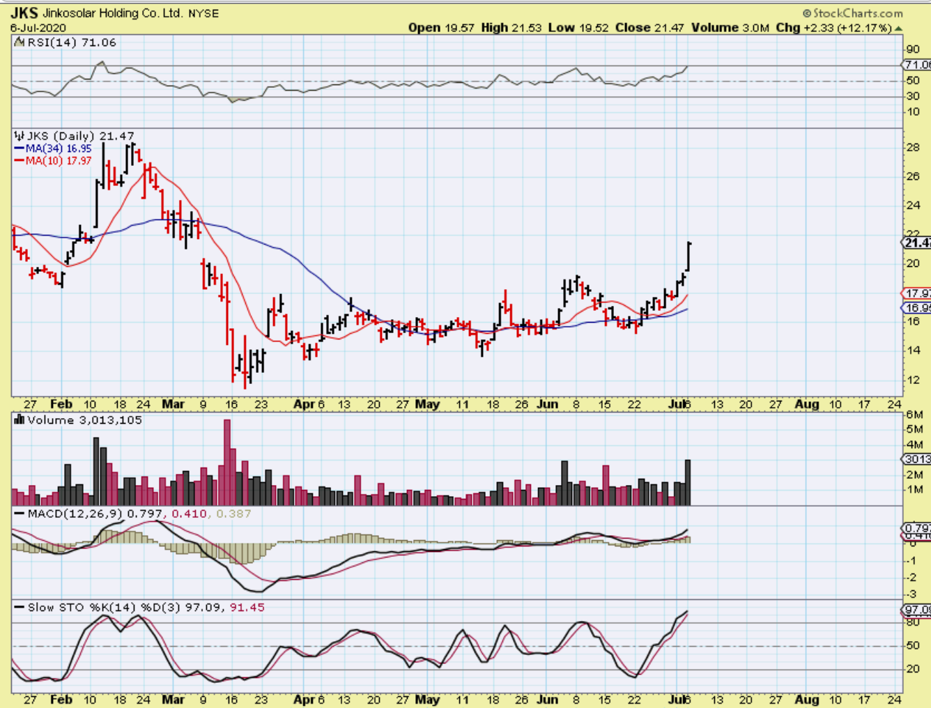 This was the JKS chart that I posted July 1. Volume was good and it looked set up to break out and run…