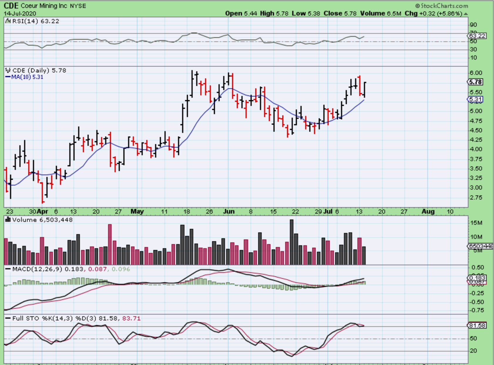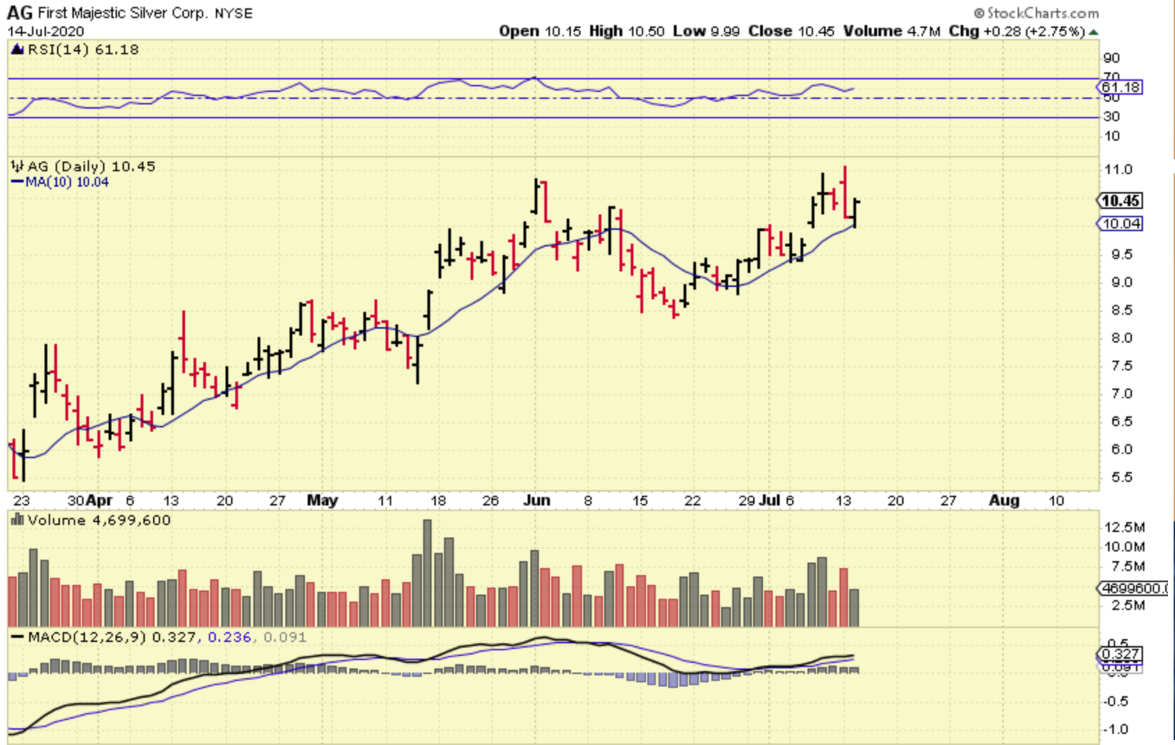 And there are other Silver Stocks that look exactly the same. Using the 10 sma ( or a looser 13 sma) would keep you in a bullish set up. These are tricky markets. They do act bullishly, but it can be difficult to ride a bull at times.