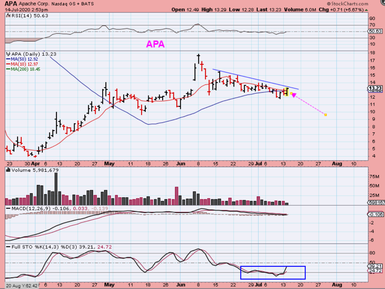 APA – APA regained the 34 sma and the 10sma. That alone is a low risk buy for me, since I can put a stop under recent lows, but I am waiting a bit longer. APA has moved from $4 to $18! THios can MOVE when it gets going. BUY & HOLD above that blue line(or here).