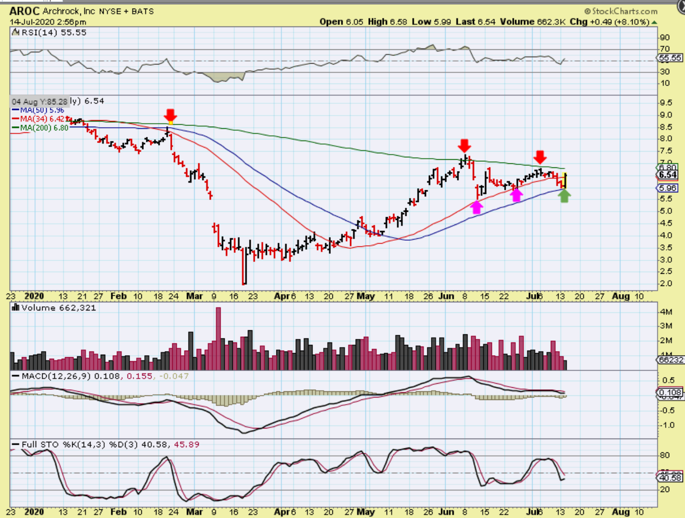I mentioned AROC in the live area, it was up 6% when I did and had reversed off of the 50sma. When I grabbed this chart, it was up 8% and looks excellent, as it approaches that 200 sma. It finally closed up 10% and is pushing on that 200sma. This ran from $2 to $7.50. I like the upside potential of these as they recover.