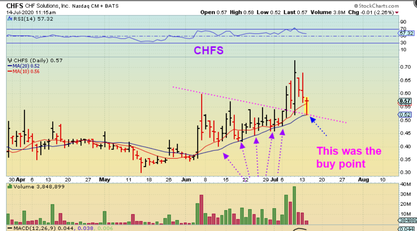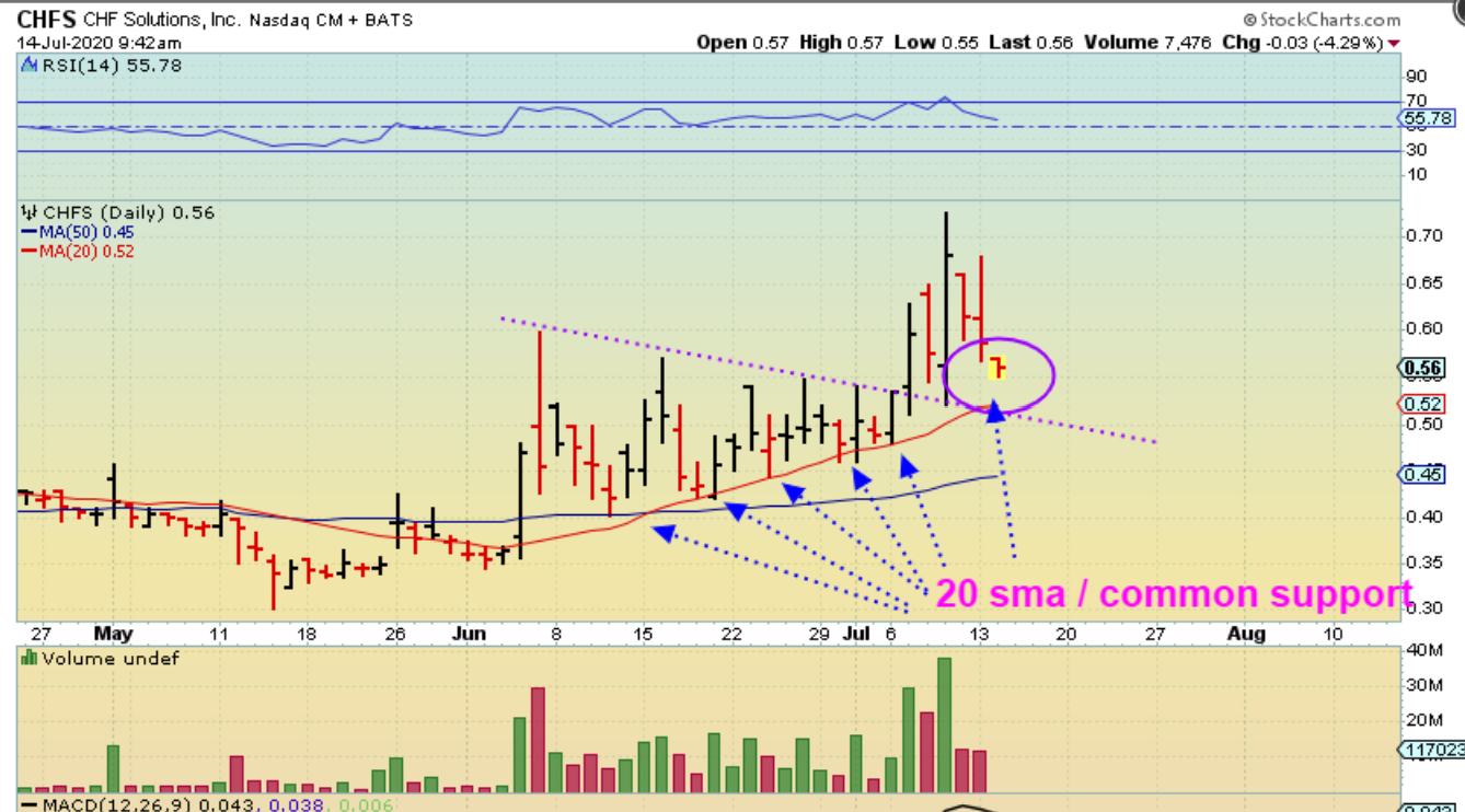 CHFS dropped to the 20sma as a back test and bounced. Can you believe how clean that was? Buyers showing up at the 20sma again and again and again. So this is actually acting correctly so far.