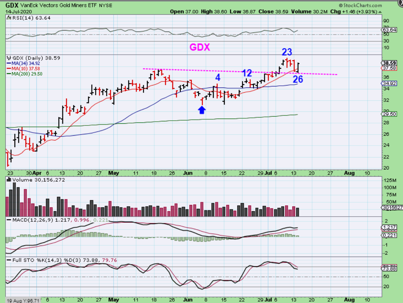 GDX also still looks bullish. This reversal is on day 26 and it almost regained the whole sell off candle from Monday. This CAN continue higher.