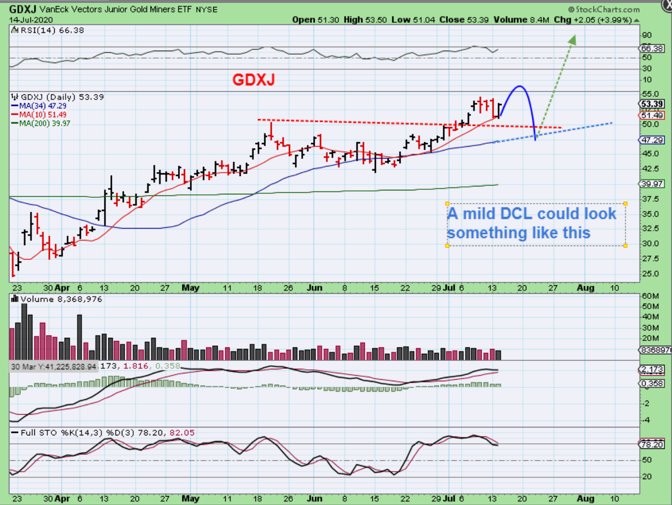 GDXJ – So if it does move higher and yet we still expect a dcl, we could see something like this, where the 34 sma ( or 50 sma) comes into play.