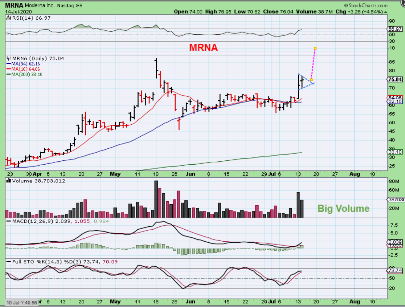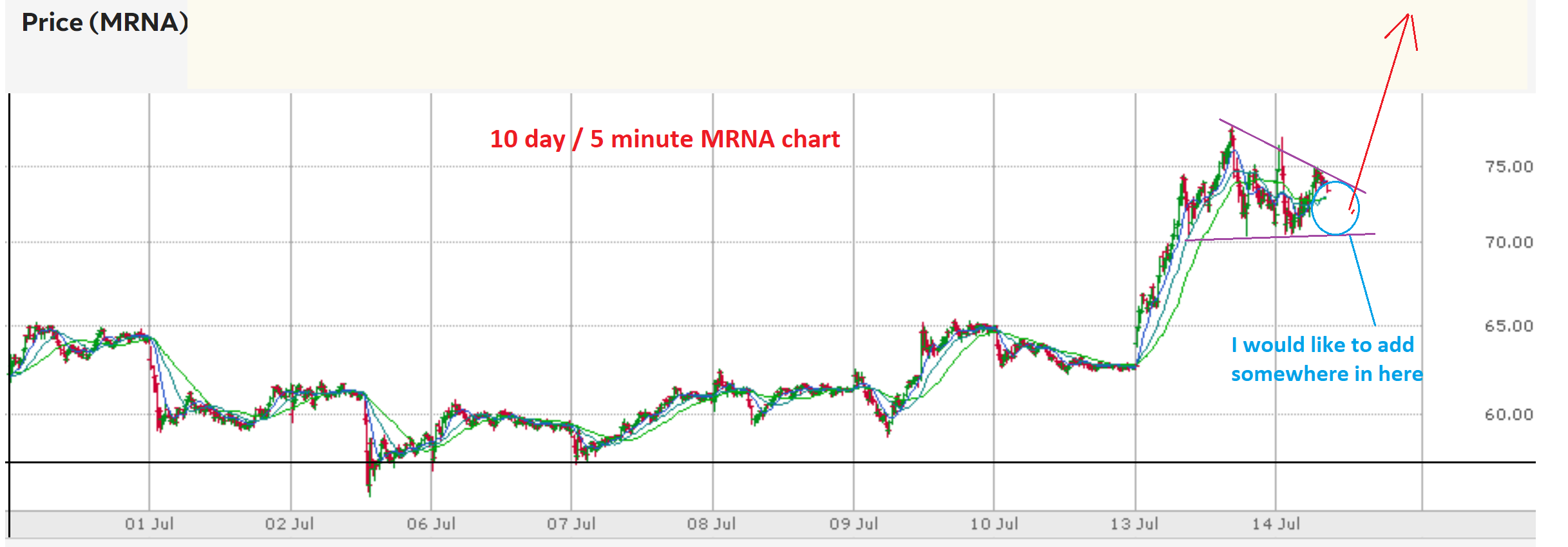 MRNA INTRADAY – On a 10 day chart, I used this in the live area to show that I wanted to add to MRNA and this bullish flag was a good place to enter. A drop to $73 was my buy & it dropped and picked me up. I posted that live…