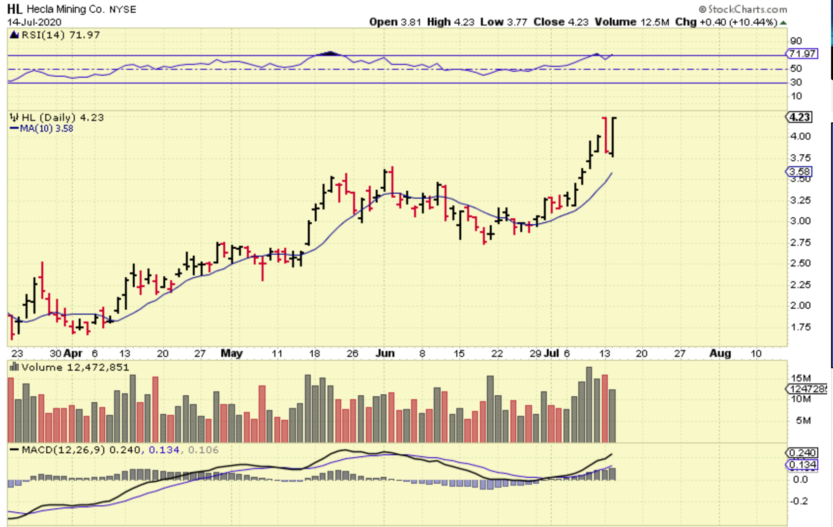 HL – Still be in the trade., and many other silver stocks are still acting bullishly at the 10 sma.