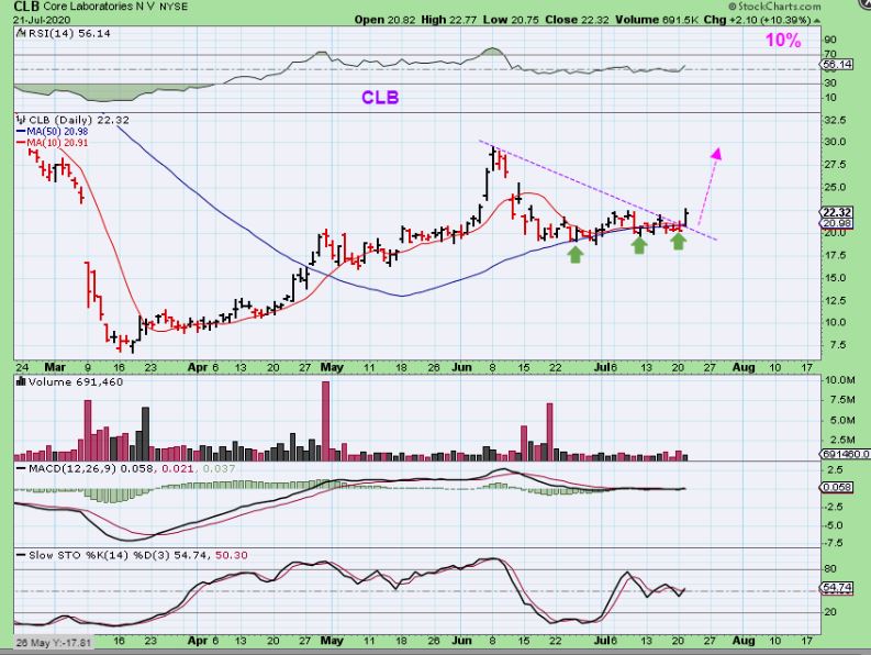 CLB has been riding the 50sma for 3 weeks but now it is starting to lift off. It was up 10% Tuesday and may be ready to run back to the June highs. That is $22 to $30.