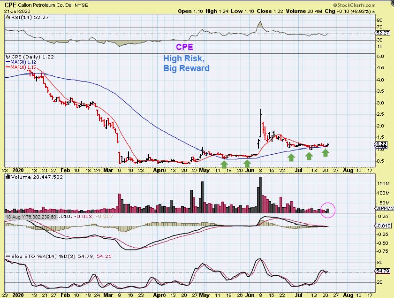 CPE – I ( and some other readers here) bought this where the first 2 green arrows are in a ‘base set up along with OAS. Suddenly they both surged higher and we locked in 200-300% gains  🙂   CPE has now dropped back to the 50sma and is siding it nicely.  There is more risk to these lower priced stocks  ( possible ‘offering’ that drops price or even talks if bankruptcy), so these low prices set ups are bullish, but have added risk.  To avoid this risk,  stay with APA, PVAC, SLCA, MRO, VLO, etc.