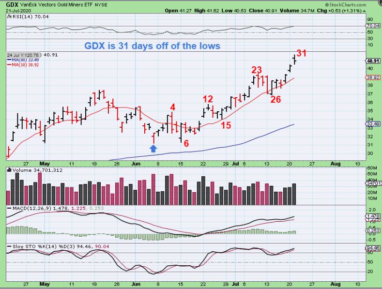 We have enjoyed exceptional trading & Gains in many areas of the markets, with Miners becoming quite bullish since the March lows. After a recent consolidation that formed a cup in that sector, the break out helped miners to take off upside. It may be getting close to a time that they’ll pull back, so just be aware of that.