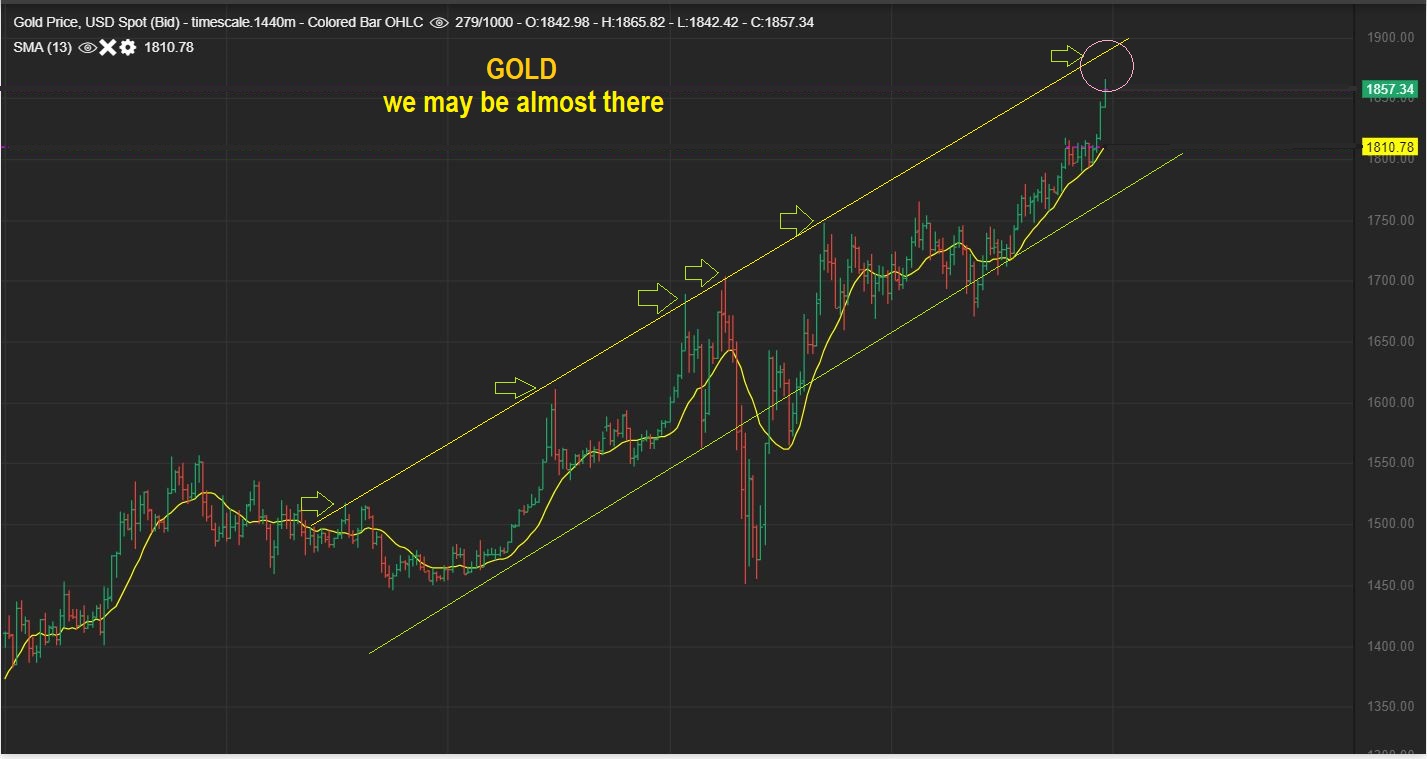 GOLD  – I pointed this channel out a while ago and even as steep as Gold has been running, it could go higher to get to the top of the channel. Yes, GOLD CAN KEEP RUNNING FOR A BIT LONGER.   Sure, we also could get a dip (a Dcl?), and THEN PEAK with the next push higher, but so far Gold is just bullishly stretching out here.