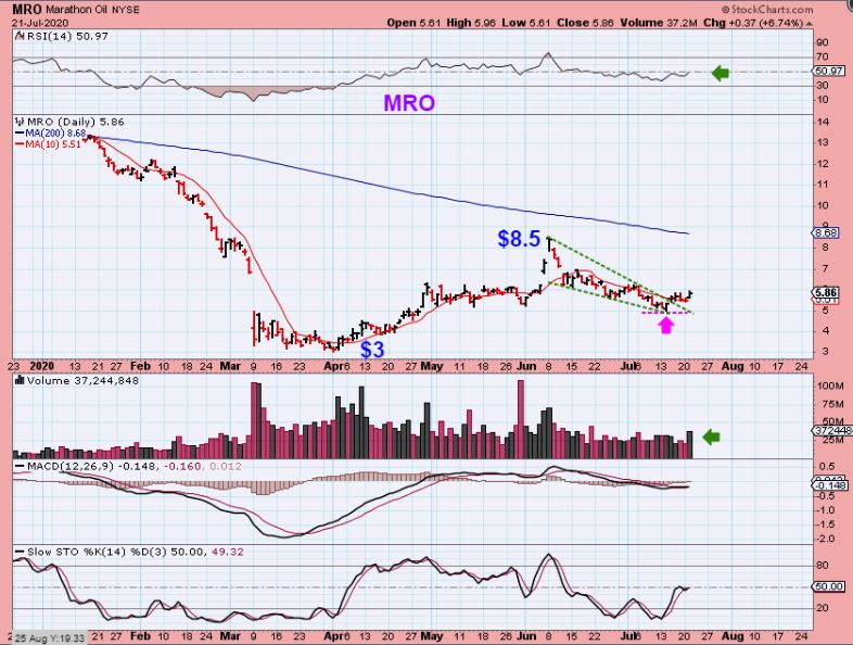 Speaking of MRO- Marathon Oil is a fairly well known company that ran roughly from $3 to $8.50 and has now dipped into a dcl and formed a bullish descending wedge. This is a buy and yesterdays volume shows that it is being noticed here.