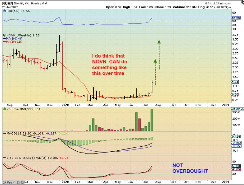 NOVN EXPLODED AND IS UP 99% THIS WEEK ALONE. We have been riding this base for a long time, and suddenly we are well rewarded.  That is a fire-pole to the left, and guess what?  I have many times seen price climb back up that fire-pole over time if volume buying comes in.  Well- look at that weekly volume ( Hello! That is only as of Tuesday!!). TAKE A LOOK AT WEEKLY CHARTS OF CHEK & BNGO TOO.