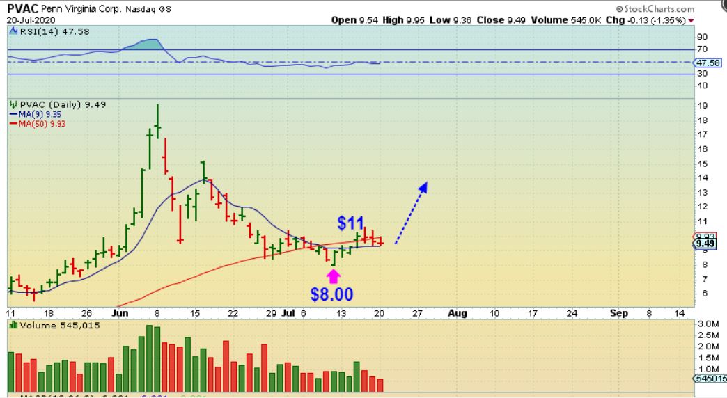 PVAC  was in yesterdays report as  a bullish set up that already bottomed at $8 and moved to $11…
