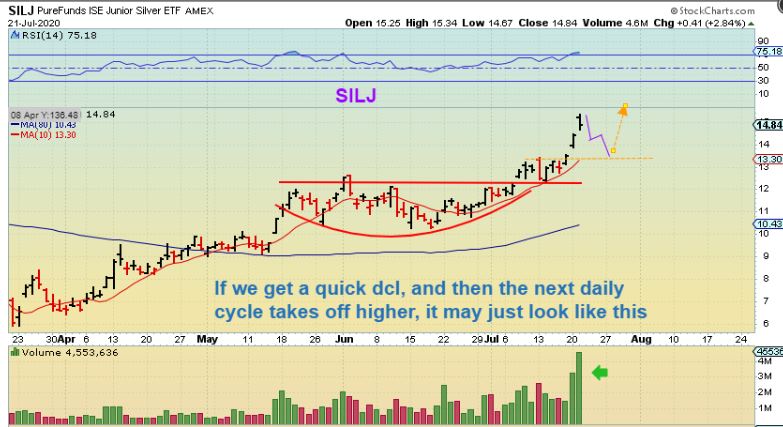 SILJ  – A dip for SILJ could be mild, so I am showing a typical a-b-c type dip, but it could be deeper and down to the 34 sma. Sliver moves quickly in both directions at times.