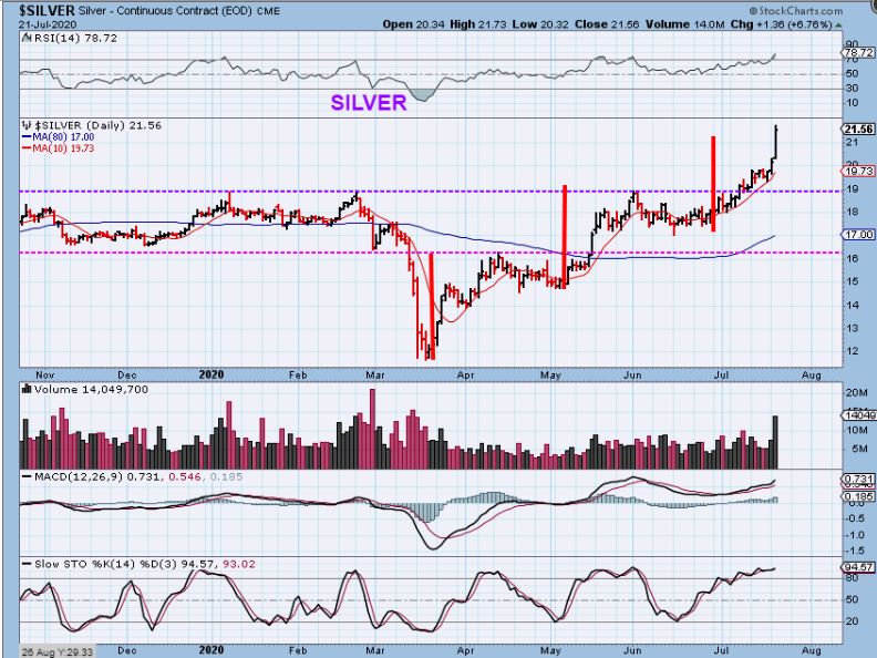 SILVER  has been a rocket lately.  It did reach a measured move target Tuesday( and 5 waves), but continued another $1+ higher in after hours.  Let’s look at a live chart from after hrs Tuesday night as I write the report…