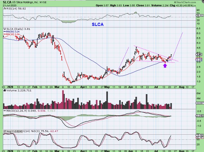 I also bought SLCA as a swing trade for the same reason.  It ran from $1 to $4.50, and only dipped to the 50sma at $3. 00.  Notice how choppy it can be, so it may be a rough ride at times, but steadier gains came after each consolidation and one is just finishing up here.