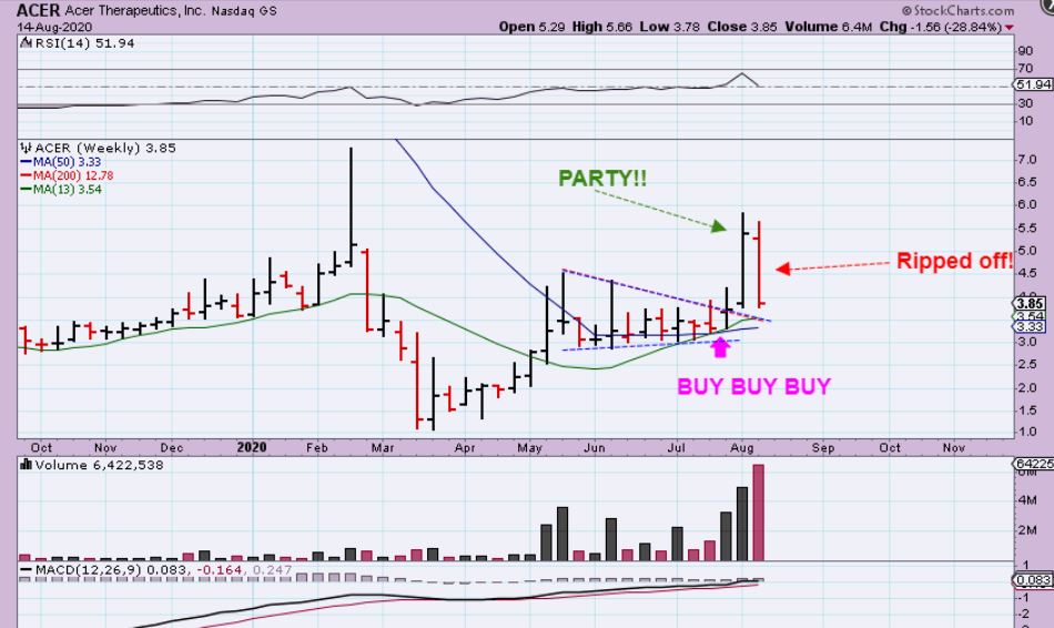 ACER WEEKLY – This is called ‘Easy come, Easy go’.  🙁   I really liked the longer term set up of ACER, so I accumulated at the low of the wedge and added on the move higher.  We got a STRONG POP in early August,  Gains galore. Friday alone saw ACER selling off,  GAINS NO MORE.  This week those gains  went through an evaporation process, and I got out after hitting 2 stops.  This is just an example of winning & losing because I didn’t sell the pop like I usually do. Why didn’t I sell the Pop?