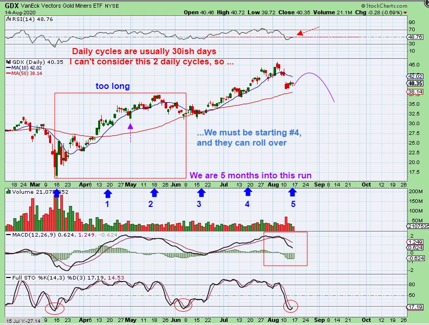 GDX WEEKLY CLOSE UP – At the top of the 2016 run, there was a small double top , with the 2nd pop higher than the first.  THAT was the top.  Could we do that now with the new daily cycle starting? A new high?  It is possible.