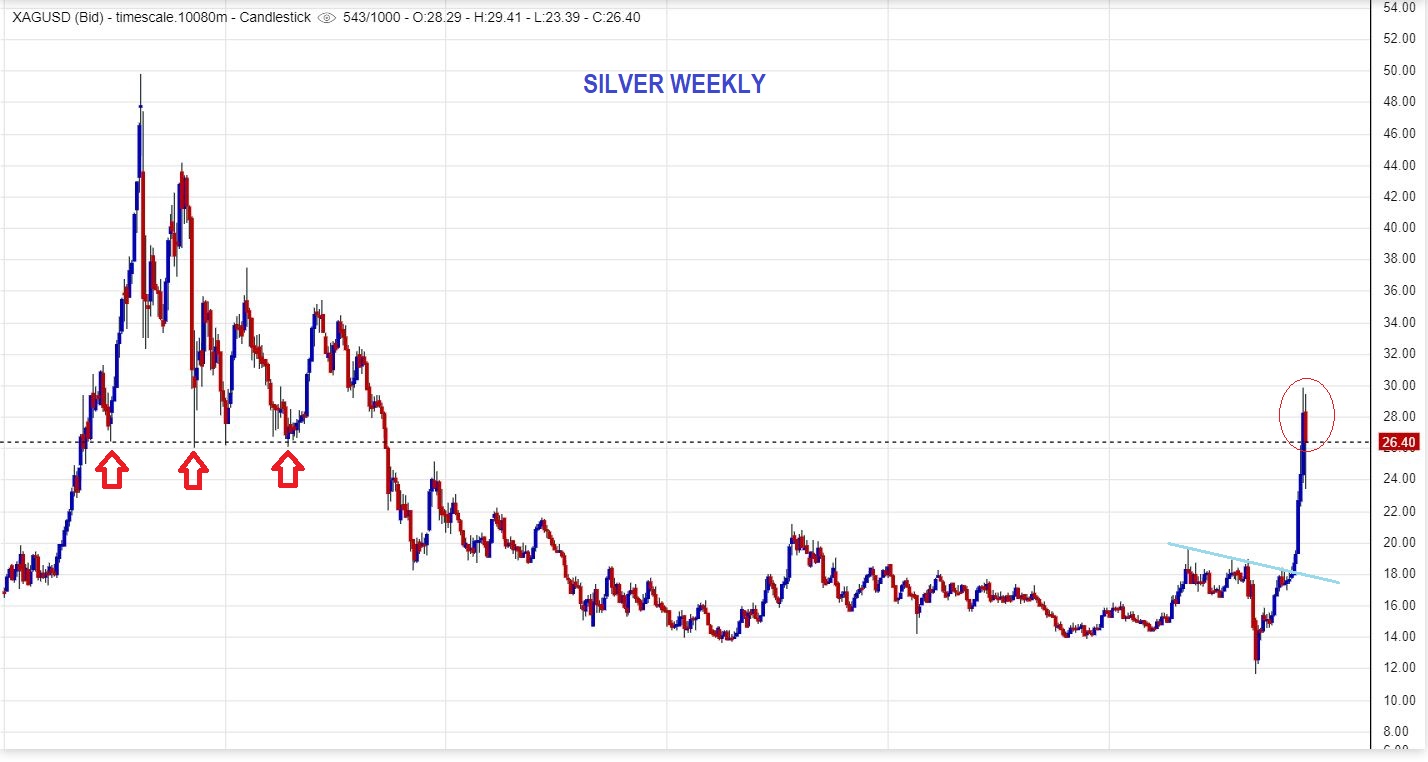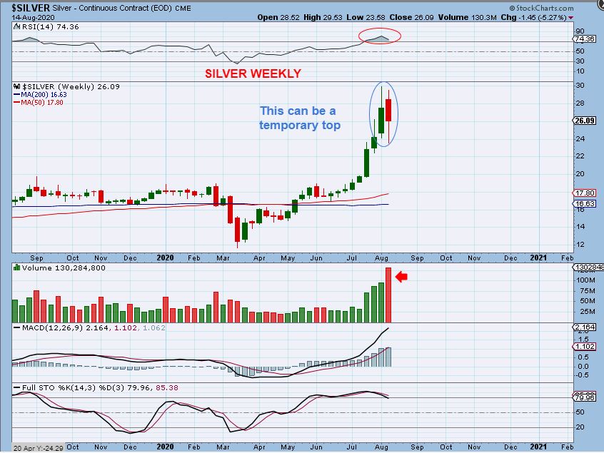 SILVER WEEKLY  – This also have 2 topping type candles in a row.  Last week was heavy volume in GOLD & SILVER. This week did not go higher than last week.