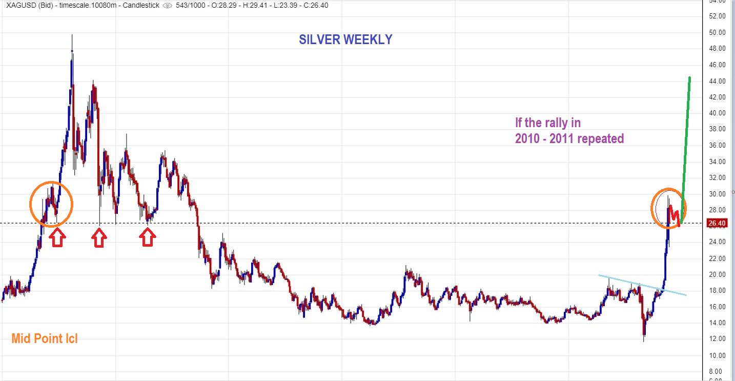 SILVER 2010 – 2011 run to the top : As a weekly chart, if we chop and stall for a few weeks, we could resemble that steep run in 2010-2011. This would be the next ICL.  A strong buy.