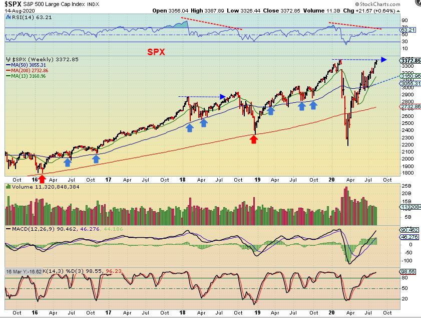 SPX WEEKLY   – The Big Picture has us at the highs again, and we do see alittle divergence. That matches that we would be due for a pull back sometime in the near future. Is that it?  Do we just double top and that is the end of the run?  You would think so due to the economic fundamentals, but…