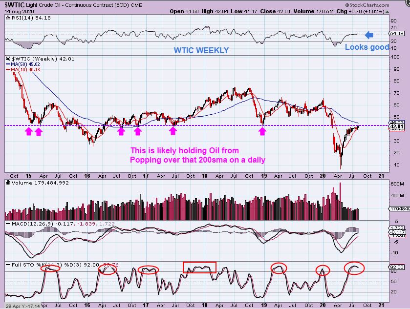 WTIC WEEKLY : On the weekly chart, we see that Oil is at a solid resistance point (Magenta Arrows) .  I’ve been expecting a push through it higher, but the longer that that takes,  the weaker an intermediate cycle could become, so we want a break out sooner than later.