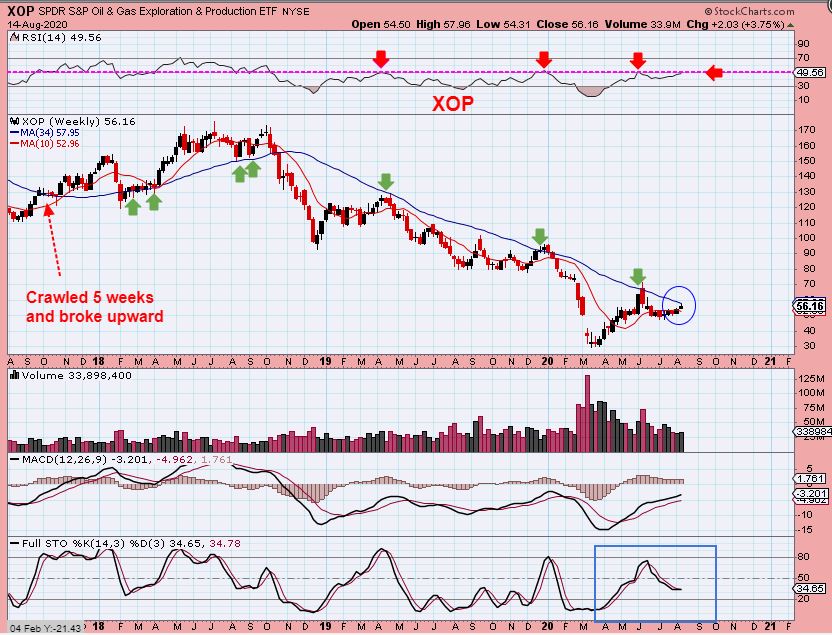 XOP WEEKLY  – We have been waiting for the XOP to run higher, but it has stalled with Oil. You can see that it was a good run out of the ICL  (we made money on that 1st leg up this spring with OAS, CPE, APA, AROC, PACD, SLCA, PVAC, CLB, etc ,  but what about the 2nd leg higher?   I’ve been waiting for a 2nd leg up…