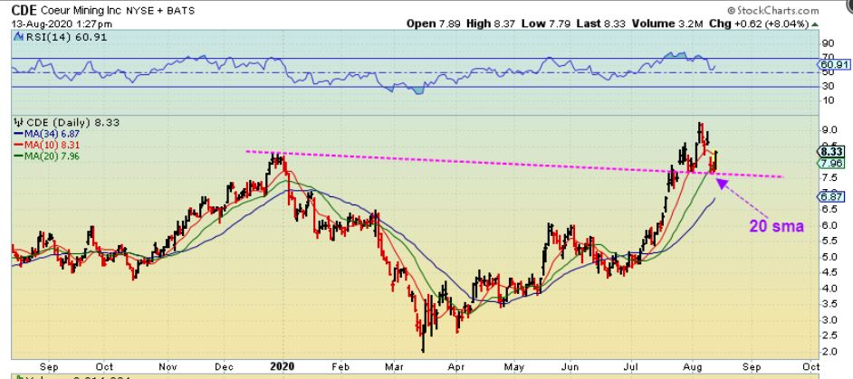 So we look at a stock like CDE – I posted this Midday in the live area saying that it could be bought with a stop under recent lows. It has also reversed at a common support area (20 sma)