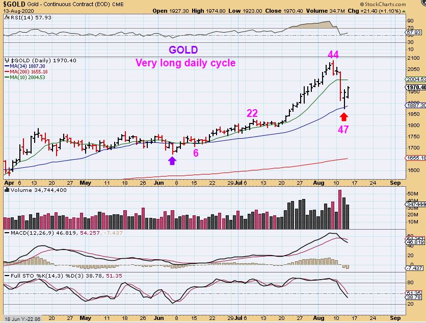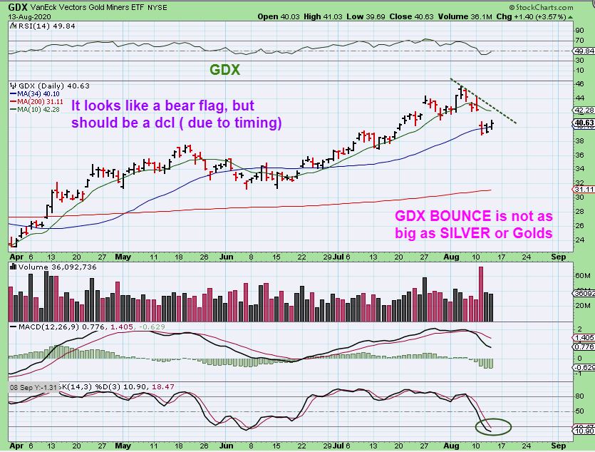 SILVER has broken above the 10 sma and Silver has a strong reversal that does look like a dcl. Remember how Gold had 15 straight days higher without a break? That contributes to the deep drop to the 34 sma. A flash crash. Silver did not do that on the way up, so it only dropped to roughly the 20 sma and looks like it could easily break to new highs.  For that reason, I bought Silver stocks, and can place a stop under the recent lows. Silver looks good.
