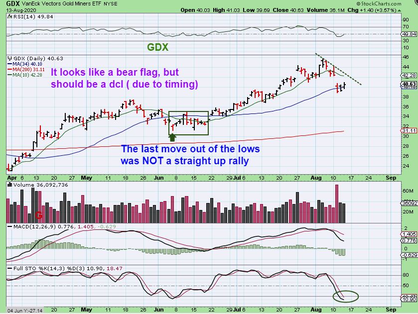 GDX#1 – GDX does not look like as big of a reversal as Silver or Gold really, but that is good if you didn’t buy yet. Do we wait for the cross of the 10sma & break of that overhead downtrend?  I feel that that is waiting too long under the current circumstances.  I say that We are near the lows, it is oversold,  and this SHOULD BE a dcl due to the ‘timing’ and the set up of the Main Metals. Read the chart.