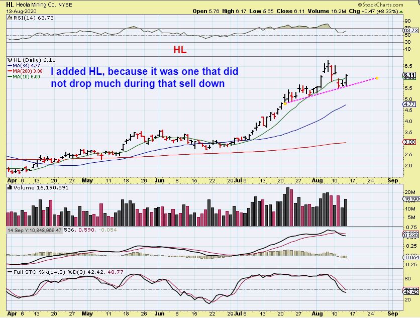 HL – I mentioned that I bought HL so this is the chart. It had a small pull back, didn’t it? It has already regained the 10sma, so you can look for Miners with similar characteristics and buy with a fairly tight stop under recent lows until these have a chance to play out or gain some upside. I would expect new highs from a set up like this, and that alone would be Under $6 to over $7.