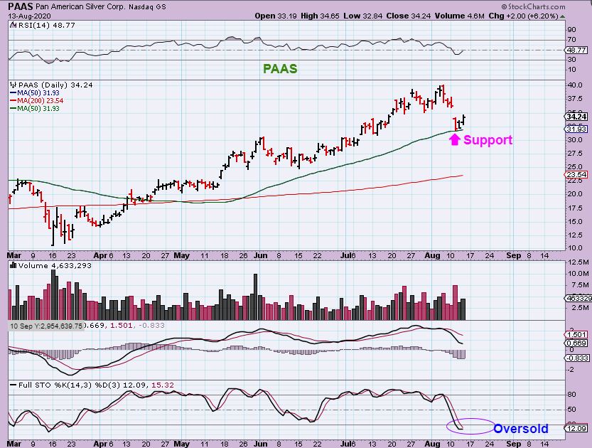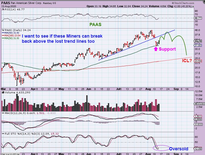 PAAS – I see PAAS on support and this could be bought , assuming that we are at a dcl and this has become oversold. From here, will it rally to new highs?  It could, and that would be nice from this buy point,  but the possible weakness that I said I would be looking for is drawn on the next chart.
