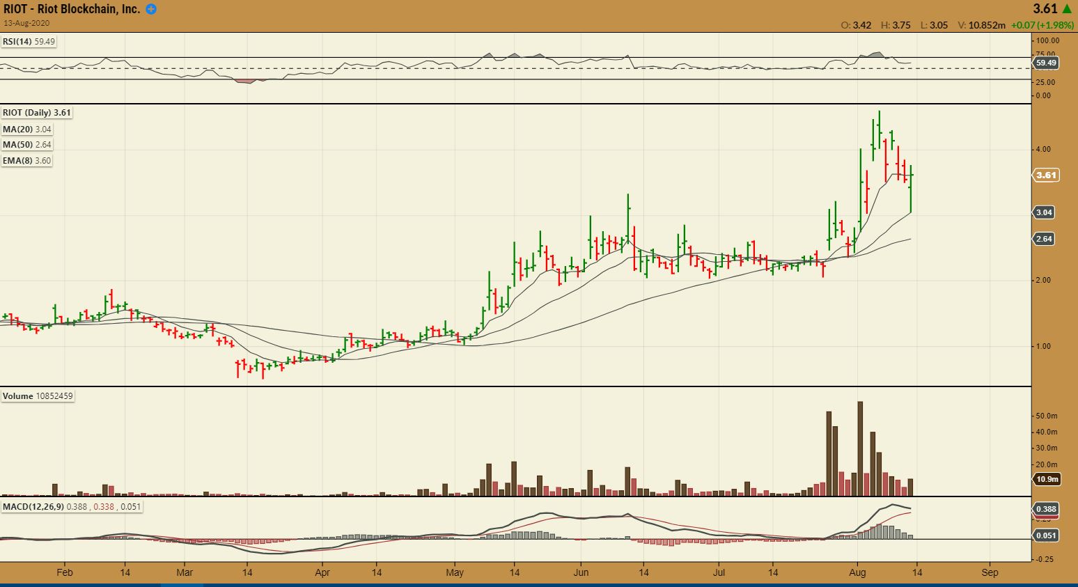 RIOT – I couldn’t believe it when I got home and saw this at 6 p.m. RIOT dropped to that 20sma and recovered fully to green?  THIS would have been very hard to watch real time, but it looks good again. That was a big reversal and…