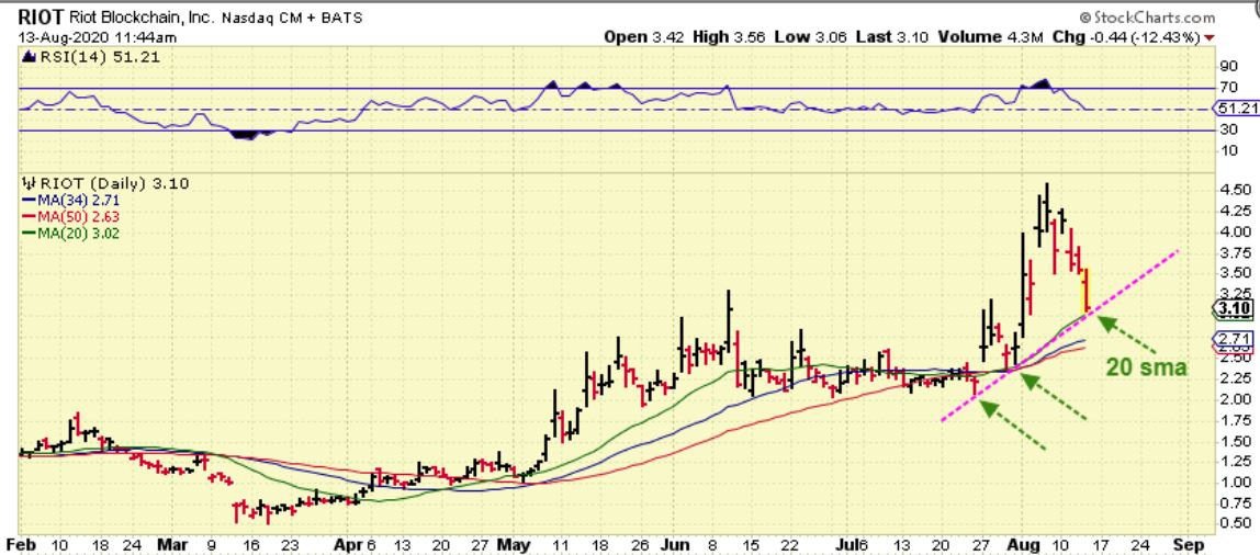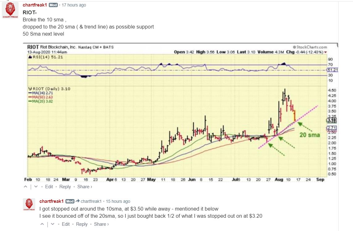 RIOT –  Since I had to leave early on Thursday and was quite heavily invested in Riot, I put a sell at $3.50 for a part of my position . The 10sma was $3.65 and I figured I’d sell if Riot got that low, breaking the 10sma.     It sold right around $3.50 and I mentioned that I lost a partial position ( not my entire Riot Position though).   Then price dropped to the $3.10 area as I checked in near midday lunch. I posted this chart at 11:44 a.m. , in the live area…