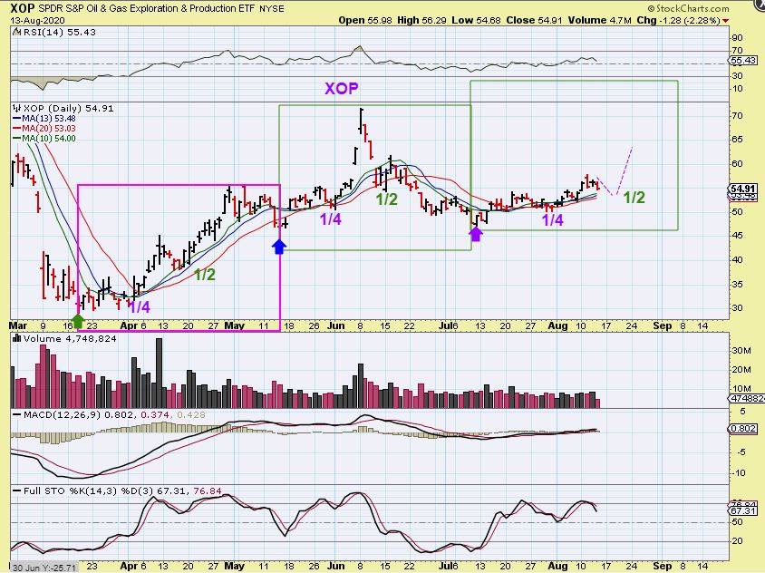 XOP #2–  POSSIBLE GOOD NEWS: Even though the XOP is getting later in the daily cycle at this point, it may just be that 1/2 cycle dip that I have been noticing in the recent market moves.  They are subtle, so that good news is that this dip might just be 1/2 way point. See the chart.