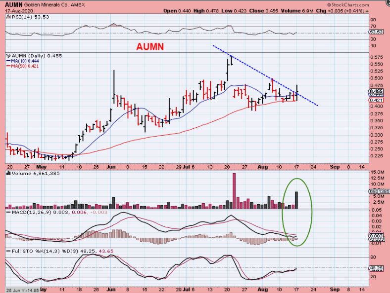 AUMN – AUMN is also breaking a downtrend with high volume, after finding support at the 50sma. I bought it for a trade and will see what it wants to do. TRX Looks very similar and could be bought for a trade.