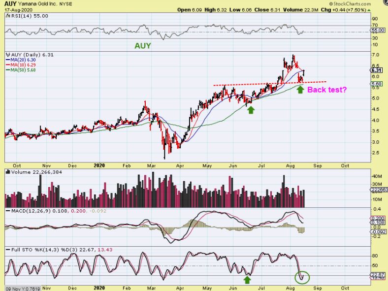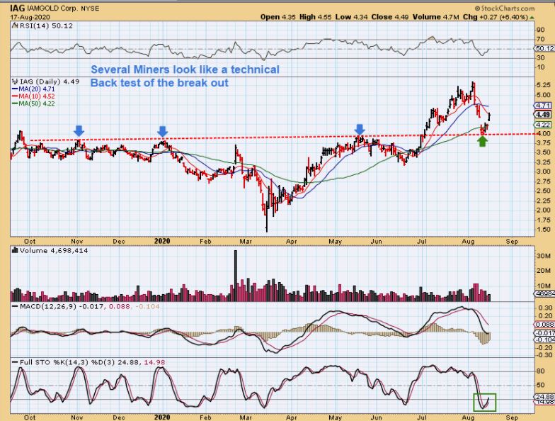 IAG : BACK TEST? – I noticed that a few of these Miners dropped sharply and seem to just be back testing the recent break out. They found support at the Buy last week, and started higher Monday.