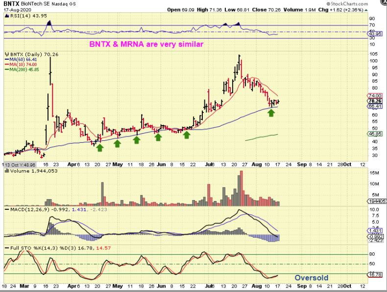 Both BNTX & MRNA are working together on a Covid Vaccine. I have actually traded both of these successfully off of the 50sma area (using the 60 sma here, it is clearer). They both rallied together and now landed in the 50 sma area together. This is a low risk buy on support, or you can wait for it to start to push higher. Why? Just in case it crawls sideways as a bear flag, but this does look good and your stop will minimize losses.