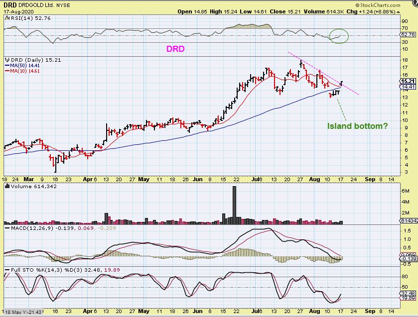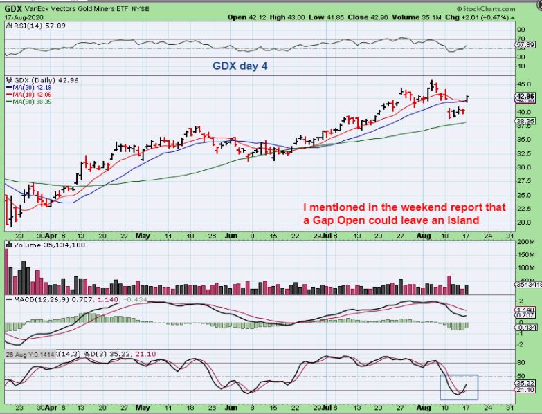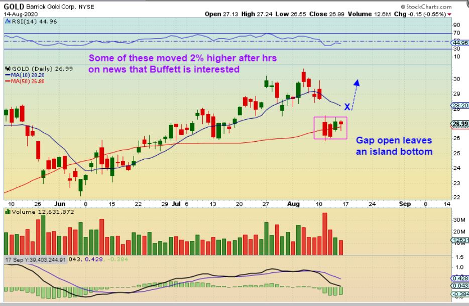 WITH FRIDAYS AFTER HRS POP IN BARRICK GOLD, I WROTE: A few Miners went higher in after hrs on news that Warren Buffet ( a long time outspoken hater of Gold or Miners as an investment) , became a buyer of Barrick. IF they gap open Monday, these could look like Island Bottoms. A bullish low for now. We’ll see what Monday brings.
