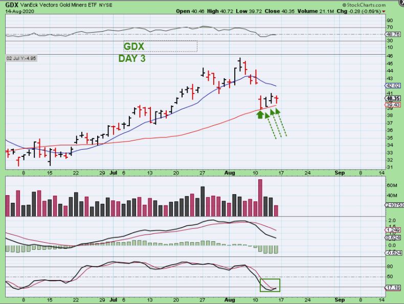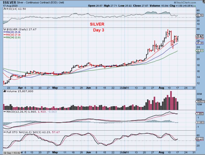 SILVER – Silver is also on day 3 and moved off of the 20sma . Silver had 1 crash down day that erased almost 2 weeks of gains, but then dropped & flipped higher then next day, and the timing was right for a dcl at the 20sma.