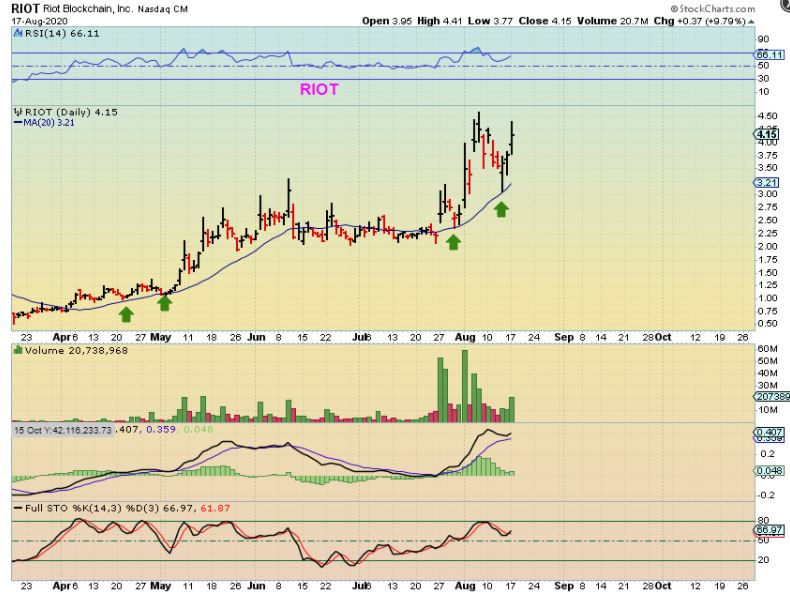 RIOT – So some of us bought that dip on RIOT near $3 to $3.20. It’s already 30% higher from $3.20, and closed up over 12% if you include after hrs trading Monday. With Bitcoin pushing higher, it looks ready to go to new highs again.