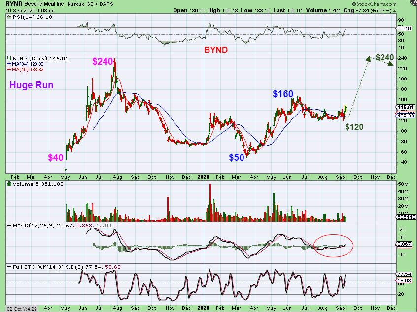 BYND – Recently I’ve been calling Beyond Meat a buy with a long term view of $240 likely. Has the choppy market changed that? Let’s see if it is still progressing…