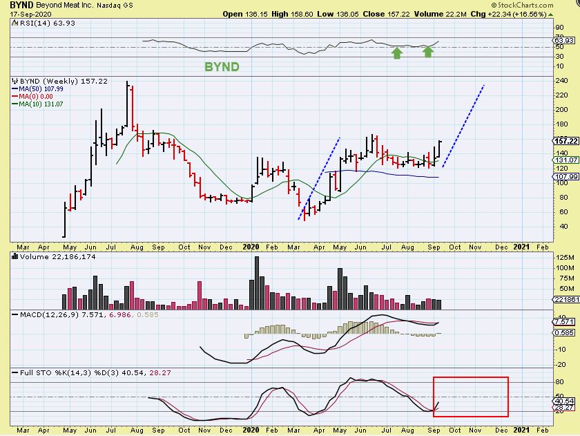 BYND WEEKLY – Beyond Meat has continued higher this week and is closing the week at the highs, now near $160. This is a swing trade in my opinion and the weekly chart is still closer to oversold.