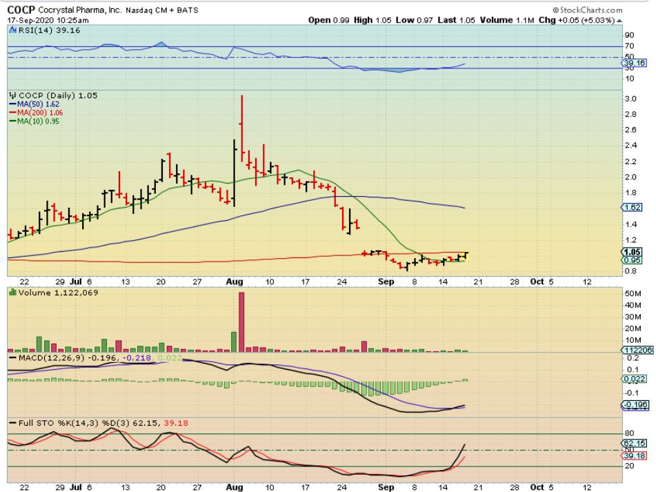 COCP -I like this set up as a Covid play, and the Covid ( testing, vaccines, etc) companies are heating up again. I bought it right in this area at $1.03 and a simple run to the 50sma is a 50% gainer, so this may become a swing trade ( hold it for a week or more) for me.