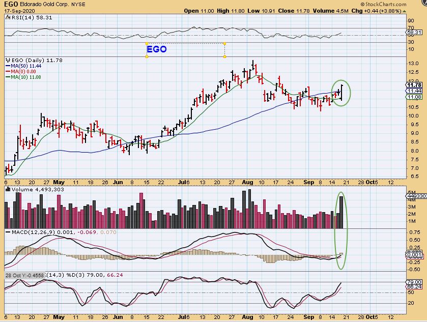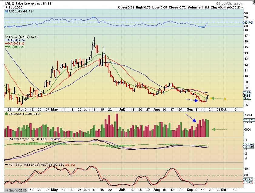 TALO by request – This is a bullish low. TALO seems to have a capitulation low, where Red volume was very strong but price hardly dropped for the final 4 days of the sell off. Now volume is strong as it rises out of the low. It is in a sector that has struggled (Oil & Gas) and I don’t know if Oil put in a simple final dcl or an ICL, so proceed with caution.