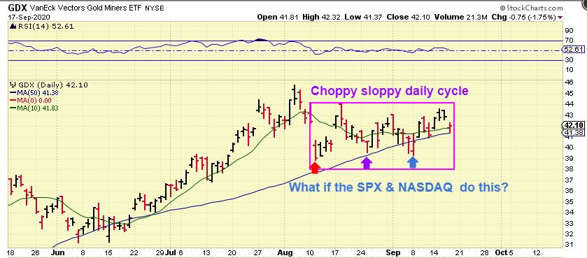 What if the SPX just becomes a Choppy sloppy daily cycle? Well, for a visual, it could resemble the current GDX Choppy Sloppy Daily Cycle for a week or more, until it rolls over or takes off higher. So we have to expect anything at this point.
