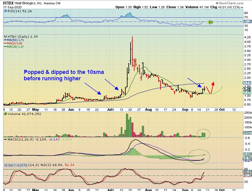 HTBX -I will try to hold these new biotech positions as a swing trade, and I might even add again if they drop & reverse. That is how I build a position from a starter to a larger position. So this MIGHT dip down from here, but I’ll be looking for a reversal at the 10sma if so.