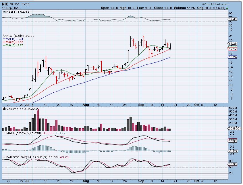 NIO – The markets sold off, but look at the Electric Vehicles and SPAC stocks. They are still doing well, so NIO has been a buy & hold since the $13, $14, $15 area and it is still playing out bullishly though choppy and consolidation. It dropped & reversed off of the 20sma yesterday, it looks like it may be ready to break out. It can be bought ( or add to position) here. It could be viewed as a Pan & High running Handle