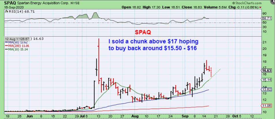 Before the Market even opened around 9 a.m., I posted this chart saying that I had sold some SPAQ Above the $17 area and wanted to buy again at $15.50 – $16. I drew the drop to the 10 area here to show what I would like to buy.