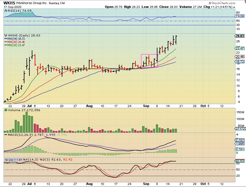 Speaking of a Pan-like Pattern: WKHS is still running higher as it hit new all time highs yesterday. It did drop at first Thursday, but then it closed at new highs again, despite the Market sell off. The sector has been Hot.